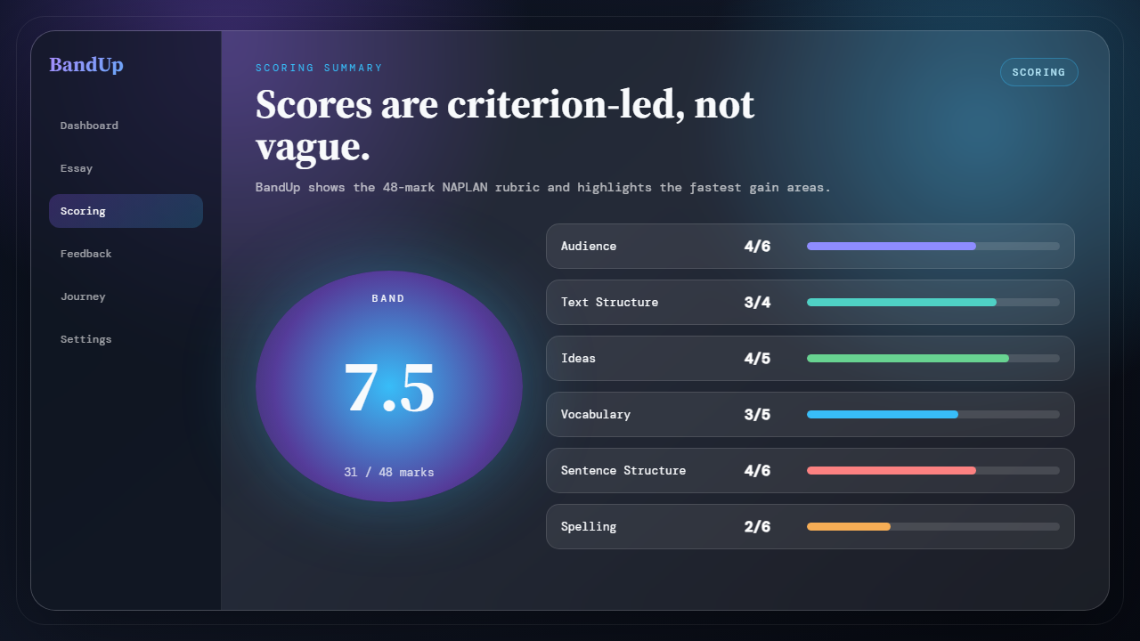 BandUp scores against the NAPLAN 10-criterion rubric and returns a practical Band 4-10 estimate, with plain-language context for what to coach next.NAPLAN